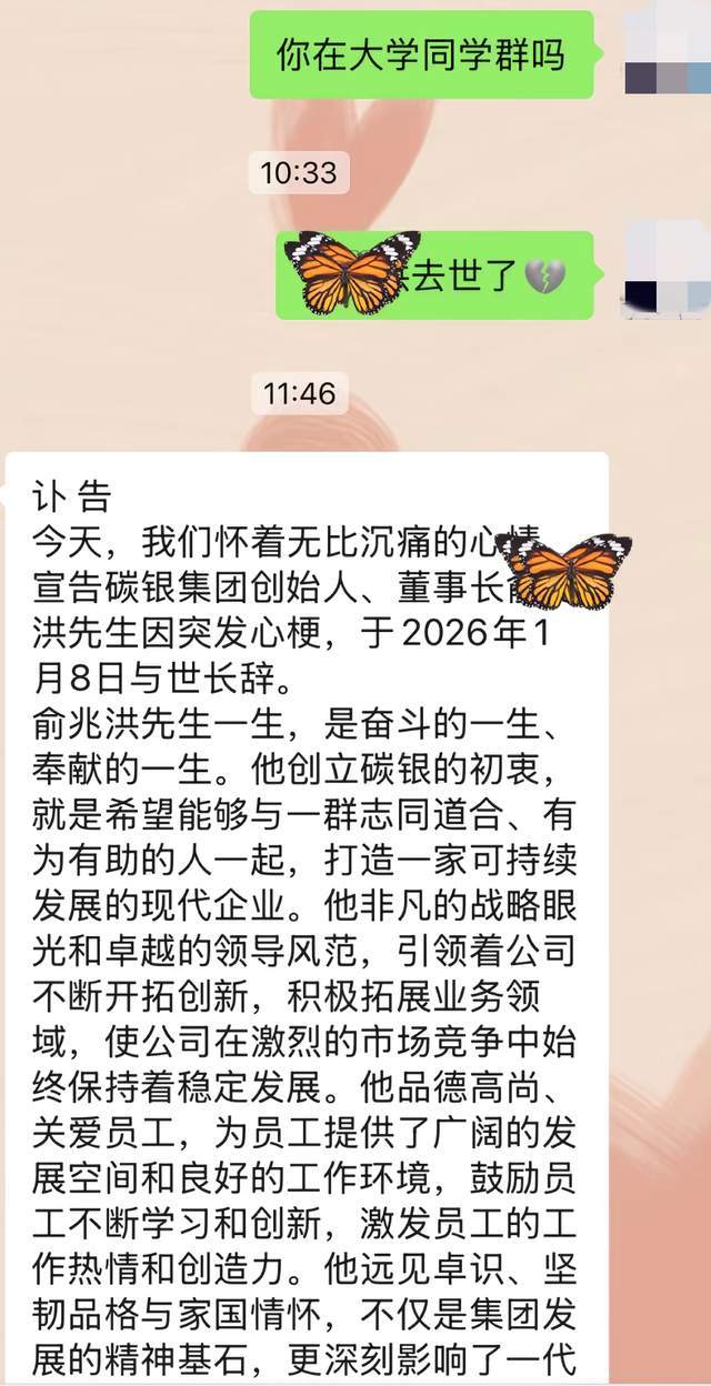 从其分享的讣告内容中可以发现,他的好朋友是碳银集团的创始人也是董事长,虽然名字被打码,但根据某科的资料可以得知,对方名叫俞兆洪,出生于78年,也就是说去世的时候才48岁。